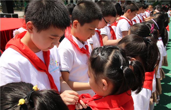 鲜艳的红领巾映着新队员朝气的脸庞,相信一年级的新队员们会像一只只雏鹰,在少先队的蓝天下健康成长,自由翱翔!