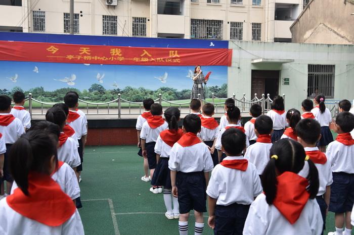 6月1日上午,亭子桥小学举行了一年级学生入队仪式。在充满朝气和活力的少先队队歌声中,在一年级家长们热切的目光里,仪式拉开了帷幕。大队辅导员宣读了新入队队员名单及中队辅导员名单。81名新队员,脸上洋溢着自信的微笑,排着整齐的队伍,五、六年级的大哥哥大姐姐为他们带上了鲜艳的红领巾。随后,一年级的新队员代表讲话,表达了自己入队后的喜悦心情,并且表明了争做优秀少先队员的决心。冯晓奕校长对新队员提出了具体要求和殷切希望,鼓励每一个新队员牢记校训,努力学习,勇于探索,每天进步一点点,争做文明好少年。在大队辅导员的带领下,全体队员庄严宣誓,铮铮誓言无比激昂。