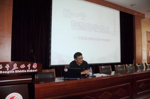 武和平校长在报告厅向来访者做了题为《做一个智慧的教育人》的报告,报告从学校文化建设的挖掘与思考,对教育的思考,对课堂的思考等方面谈了如何深入挖掘学校的文化潜力,整合和结构文化的现代教育内涵、学校个性发展内涵,其根本目的通过确立一种兼具“文”的厚度和“化”的力度的影响力机制和格局,为学生的健康成长、理想发展提供无限广阔的空间。与会者纷纷表示听完武校长的讲座获益良多,深受启发。