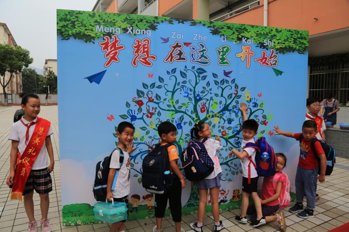 为了迎接一年级的新同学,学校早早做好了准备。在校门口红毯的两边,分别站着老师、大队委以及高年级学生志愿者。每一名新生踏入校园,就有一双热情的大手牵引着他们,在一棵小树上留下自己的手印。从涂颜料、印手印再到洗手、擦手、进班级,秩序井然,画面温馨。当小朋友们看到自己的手印印在成长树上时,一个个都露出了满意的笑脸。当大姐姐、大哥哥帮他们擦手洗手时,她们也会有礼貌地道一声“谢谢”……