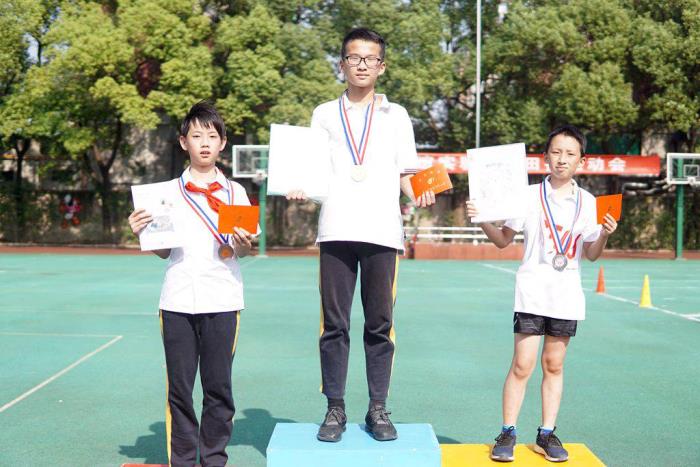 在颁奖仪式上,丁校长为获奖运动员颁发了金、银、铜牌,勉励同学们不懈努力,再创佳绩。
