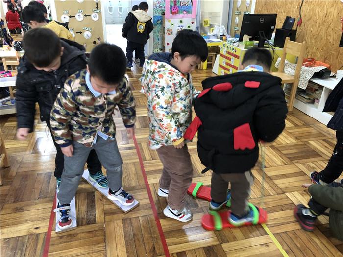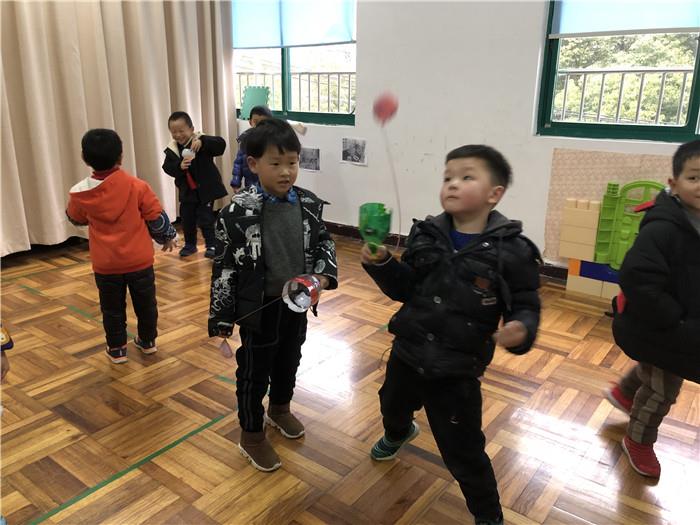 “精创”运动环境。教师们针对班级室内及走廊的场地空间特点,合理利用,因地制宜,挖掘每个角落的运动价值,巧妙布局,为孩子们创设了丰富、有趣、适宜的运动环境。如:利用室内横梁、拐角设置投掷游戏,利用封闭的走廊,创设小小竞技场、跑道等。游戏场地的设置从地面到墙面,从墙面又拓展到空中,让环境发挥出最大的价值.