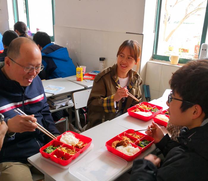 周一中午,该校王斌副校长就来到中二年级2班,从饭箱中随意拿起一盒饭,走进教室,与该班学生共进午餐。王校长边吃边询问学生对饭菜的品种、口味、数量的看法,征求学生的意见,以平易近人的姿态迅速打破了师生间的尴尬,双方相谈甚欢,其乐融融。