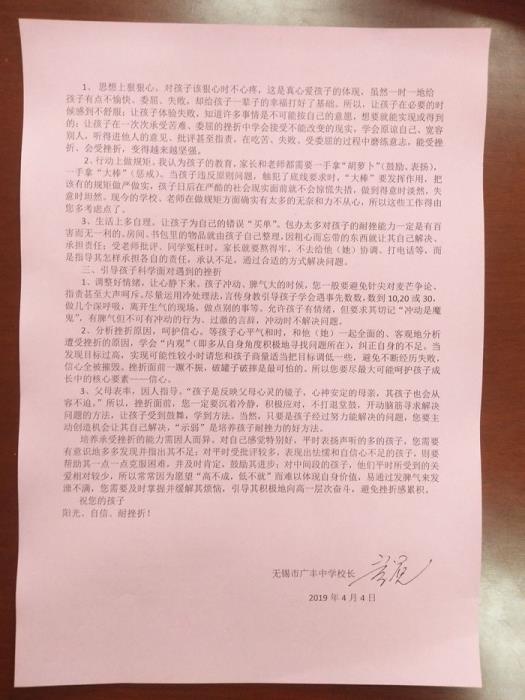 黄校长在信中建议家长从三个方面着手:一、引导孩子正确理解、认识挫折,让孩子增强勇敢面对挫折的勇气,学习应对挫折的方法;二、舍得让孩子吃点苦、受点委屈,指导其怎样承担各自的责任,通过合适的方式解决问题;三、引导孩子科学面对遇到的挫折,调整好情绪,分析挫折原因,父母做好表率。通过这封情真意切的信,加强了家长与学校相互的配合,促进了家长与孩子之间的情感沟通,增强和提高了学生克服挫折的勇气。