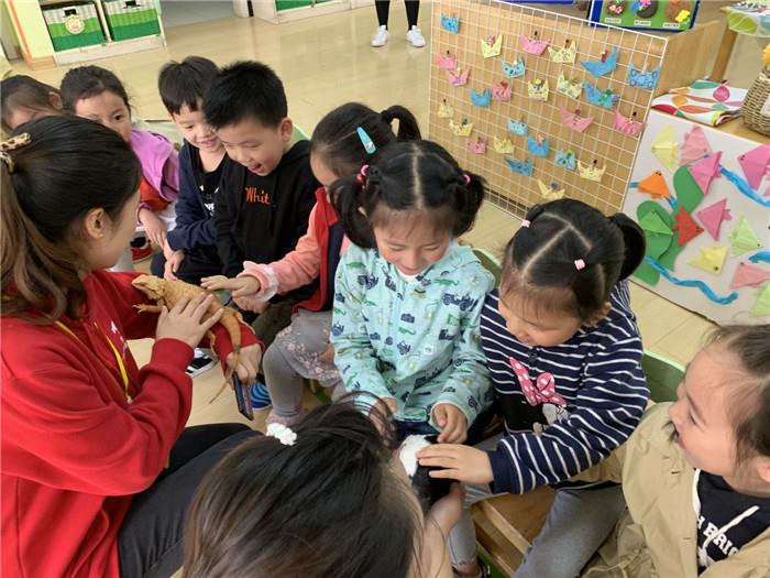 “豚鼠的毛有顺毛和逆毛之分”;“ 蜥蜴的刺不是硬硬的”;“安哥拉貂最喜欢和主人一起玩游戏”,通过叔叔阿姨的介绍,小朋友们不但近距离接触了这些小动物,而且还了解了更多关于它们的小知识。叔叔阿姨们还教会了我们和这些小动物交朋友的小技巧,让我们能够与更多的小动物成为好朋友。最后小动物们进教室的互动环节将我们的活动推向了高潮,孩子们怀揣满满爱意,与小动物们成为了真正的朋友。