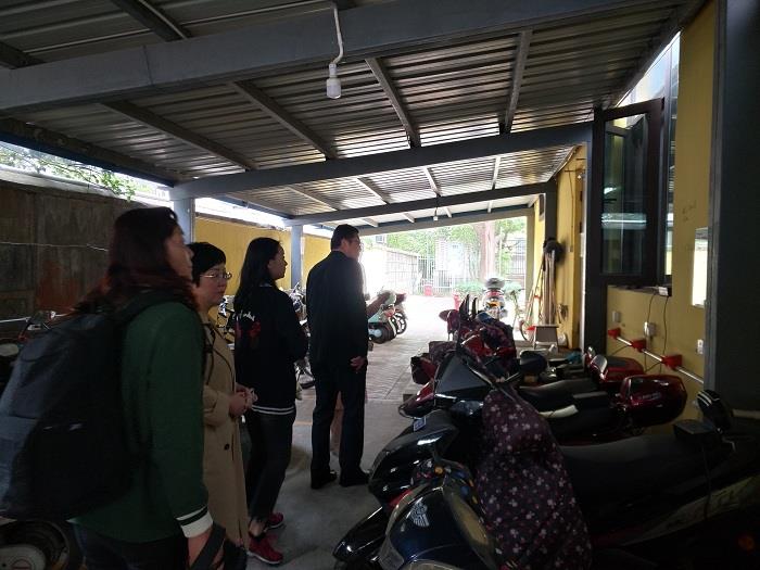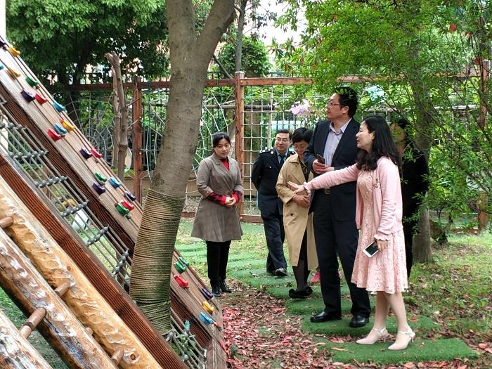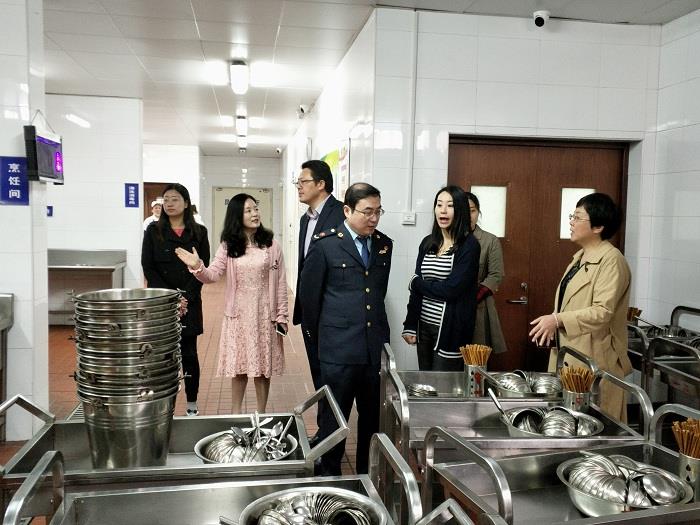 周迎新园长陪同黄巷街道社区事务办公室王俊主任等一行六人对整个校园环境进行了全面检查。树木刚刚进行修剪、泥土正在翻整,工具等摆放在指定处,井然有序;户外活动器械平衡桥上的螺丝整修加固过,大型滑滑梯、滑索定期保养,安全无隐患;教师电动车库已经安装智能自动充电桩,手机能随时查看充电状况,电瓶充满还会自动断电,安全便捷。紧接着,王俊主任带领大家重点检查了食堂。餐车专用电梯的加锁、食堂门的电子锁、库房的双人双锁都让大家感受到幼儿园对食堂安全的重视。食堂人员身着白色工作服、戴着口罩,正在包馄饨,整洁的工作台、规范的操作流程,让检查人员连连点头。