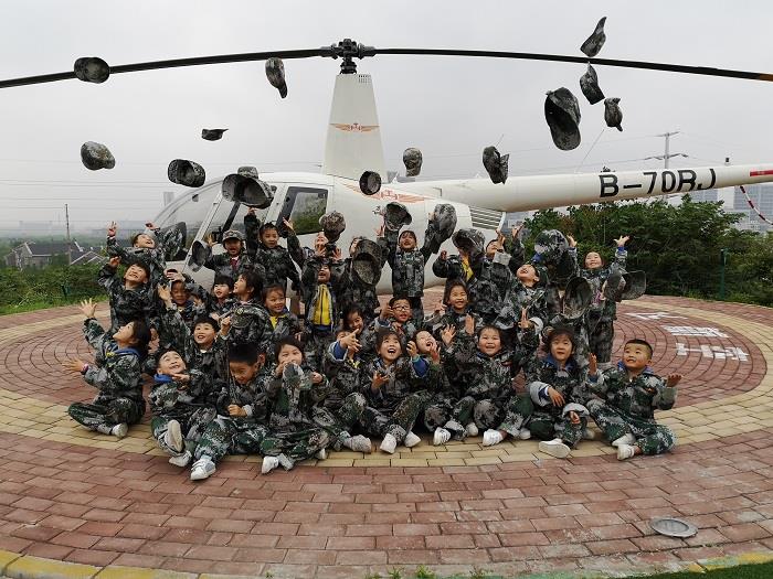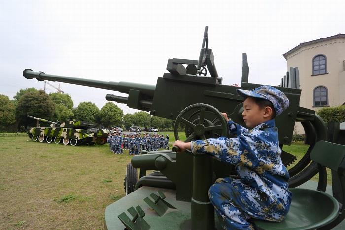 一来到国防基地,全体幼儿在开营仪式上迎军旗、授军衔,观看了教官们展示的队列、擒敌术、战术等一系列英勇威武的操练表演。孩子们情不自禁地模仿着做起了动作,也学着教官们进行了简单的队列练习。在基地的第一天里,孩子们开展了火灾逃生演习、轻武器射击、手榴弹投掷,大家还参观坦克、火炮、直升机、航模等,感受到祖国妈妈国防力量的强大。到了晚间,孩子们吃着自己亲手制作的水饺,进行洗漱,并集中观看了红色影片《小兵张嘎》。