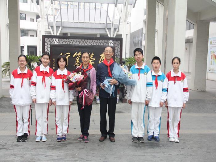 殷宝洪将军,原任解放军艺术学院政委,少将军衔。已经76岁高龄的他,心里一直记着在母校的学习生活,牵挂着母校的发展。2010年,殷将军到学校参观并亲笔题写校训“厚学笃行”。 今天,殷宝洪将军携夫人田学英女士再次满怀深情地回到母校,接受了侨谊学子们热情的献花,并被戴上了鲜艳的红领巾。
