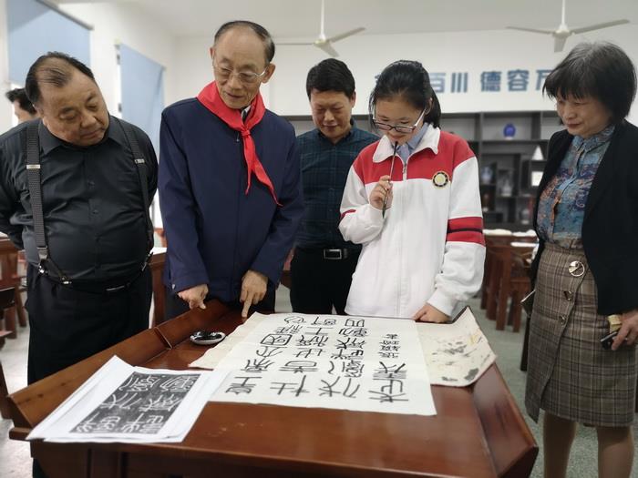 殷将军将他亲笔题写的“养正、乐业、和谐、共进”“水韵侨谊”“侨谊大讲堂”等书法作品以及《殷宝洪书法作品集》赠送给了母校,勉励母校师生共同努力。作为中国将军书画研究院执行院长,殷将军善欧楷、行草,力主“以古为师,继承创新”,提倡将军书画“大气、正气、雅气”之书风。殷将军还来到学校书法教室,亲自为爱好书法的学生们指点。