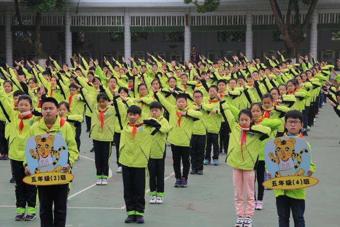 随着高成老师的一声令下,运动会广播操比赛开始了。瞧!各中队举着班牌,踏着有力的步伐来了。整齐的动作、统一的服装,为校园增添了一道亮丽的风景。