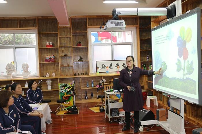 活动分为两大部分,第一部分先由部长周忠芹老师从幼儿的学习方式入手。通过绘本解读的形式让老师们感知绘本故事中色彩和情绪的变化。画面大小张力的变化,让老师们对色彩的搭配有了初步的了解。同时向老师们介绍一些有关色彩搭配的基本知识。