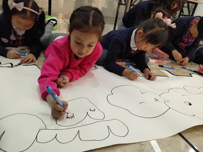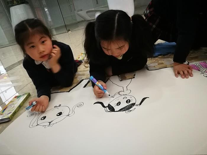 虽然天公不作美,绵绵细雨连绵不断,但是孩子们参加绘画活动的积极性依旧那么高涨。十多名大班孩子在老师的带领下,兴高采烈地来到了盛享会一楼大厅里。老师、社区人员刚刚铺开长卷,孩子们就情不自禁地开始在画纸上尽情描绘起来。巍峨的长城上方,蓝天白云阳光灿烂,鲜艳的五星红旗迎风飘扬,国旗旁是一个为祖国妈妈庆祝70岁生日的大蛋糕,还有一群活泼可爱的小朋友们在阳光下唱歌、跳舞,一起放飞手中象征着梦想与希望的七彩气球。