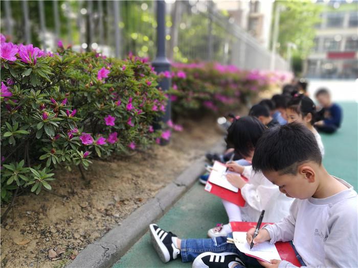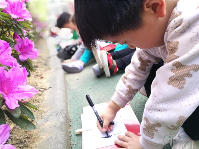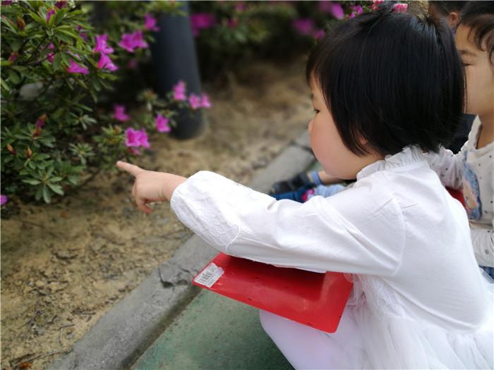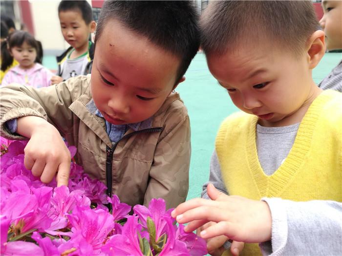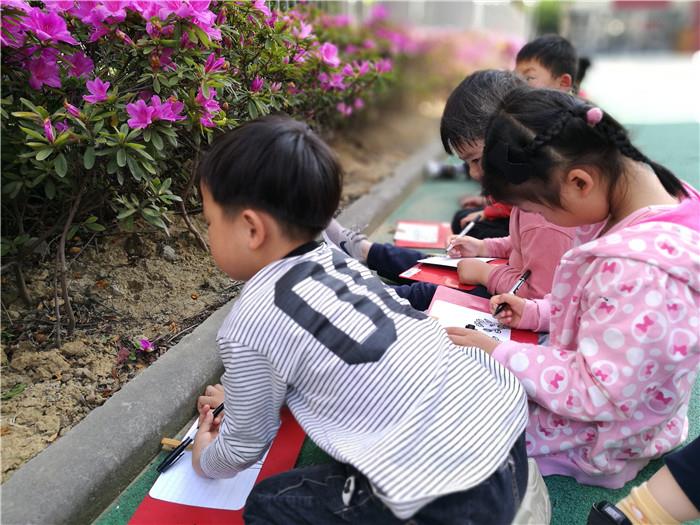 “老师,快来看呀,这边的花开得好美啊!”一声清脆的童声顿时引起晨锻孩子们的围观,孩子们七嘴八舌的议论起来:有的用手指点着花朵数起了花瓣;有的用鼻子闻闻花香;有的甚至向保安叔叔询问花的名称……幼儿园操场边的花坛里的杜鹃花一夜之间争相开放,好生艳丽。“老师,这花太美了,我们想把它画下了。”“当然可以”老师被孩子们的这份积极所感染,为孩子们的细致观察所感动!