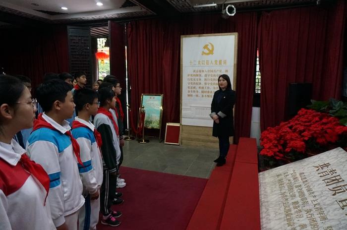 师生们首先来到第一支部旁的群雕前,广丰中学学生代表们向群雕英雄敬献花圈,清名桥小导游徐文珺同学介绍了群雕的故事背景,金星中学诸嘉凝同学带领全体学生面对雕像宣誓。少先队员用坚定的声音、激昂的誓词激励自己,将发扬革命传统,谨记党的教诲,作为新时代中国青年要担当时代责任,勇立时代潮头,争做时代先锋。