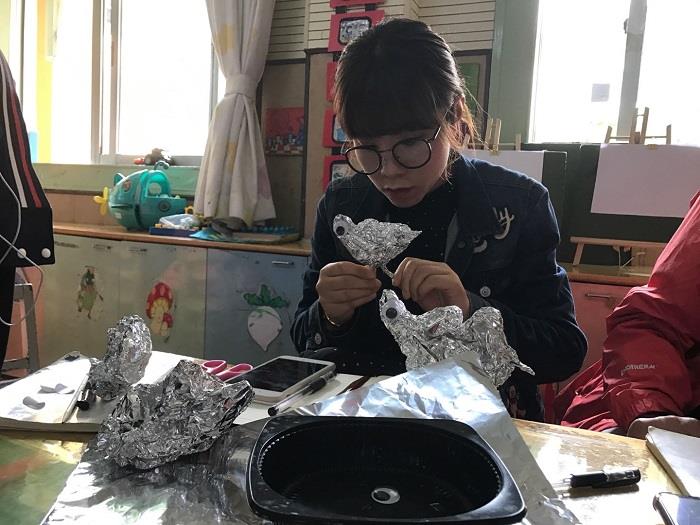 铝箔纸是由铝箔衬纸与铝箔裱糊成的一种新型纸张。它质地柔软易塑形,且塑形后不反弹,价钱便宜。铝箔纸常用于艺术课堂的手工制作,首先是由于其安全无毒,环保无污染;其次由于其可塑性极强,平面的剪贴及立体的制作效果都可以很好的表现出来;再次就是成形作品易于保存,所以受到很多艺术家们的喜爱。5月6日中午,广益中心幼儿园课题组姜瑜老师为全体教师开展了 “玩转铝箔纸”活动。