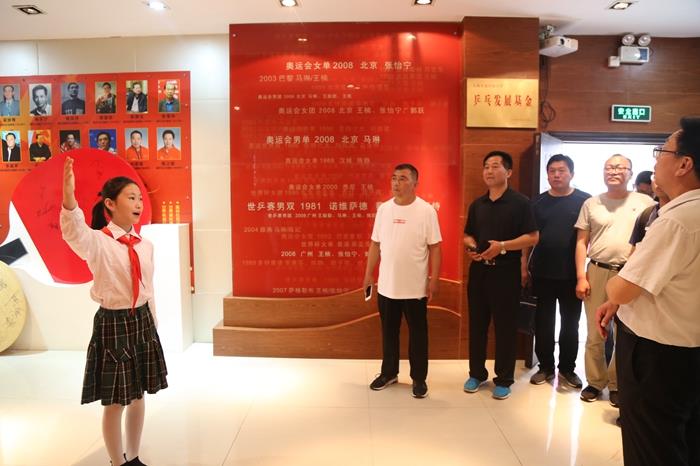 无锡市花园实验小学郭磊校长等校行政人员热情欢迎远道而来的客人,引领客人参观了校容校貌,观摩了乒乓操表演、乒乓训练、乒乓创意制作、足球训练,欣赏了合唱队表演。代表团一行参加了学校升旗仪式,观看了学校宣传片。意蕴丰厚的乒乓雕塑、内涵丰富的乒乓文化馆、雅趣宜人的振华苑,自信大方的小解说员给各位来访者留下了深刻的印象。