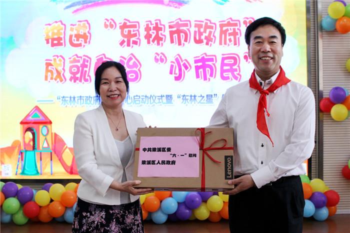 一直关心东林学子成长的区委、区政府领导也来到了大家中间。区委副书记、区长许立新伯伯,副区长夏琰阿姨,区政协副主席唐红阿姨,区妇联主席陆激华阿姨,区政府办公室主任程伟伯伯,区委教育工委书记、区教育督导室主任李正茂阿姨给孩子送上了问候和六一礼物,并观看了孩子们精彩的演出。