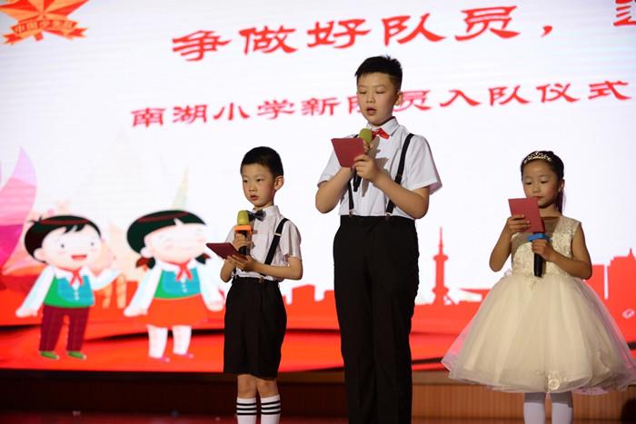 5月31日上午,南湖小学大剧院回荡起欢乐的歌声,“争做好队员,追梦新时代”——一年级新队员入队仪式暨社团成果展示活动在这里隆重举行。一年级358名新队员在老师和家长的见证下,光荣地加入了中国少年先锋队。学校各社团用精彩的节目迎接“六·一”的到来,向新队员祝贺。扬名街道的领导也来参加活动,祝大家节日快乐。