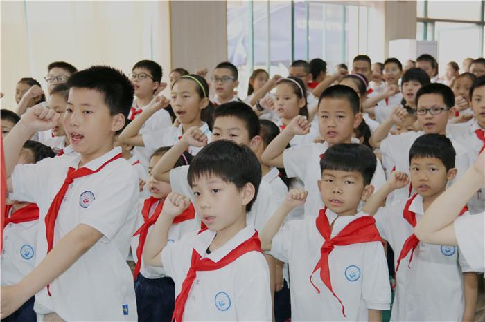 高举右拳,队员们在大队辅导员周晓老师的带领下庄严宣誓、一起呼号,铮铮誓言和“时刻准备着”的嘹亮呼号声响彻校园。