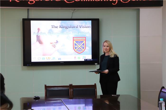 积余实验学校副校长徐单红向来宾介绍了学校的办学理念、办学特色,学生活动,重点分享了学校“五彩社团”特色课程的开发实践经验。英国金斯福德社区学校代表对学校的书法、外教面对面、击剑等特色社团给予高度评价。
