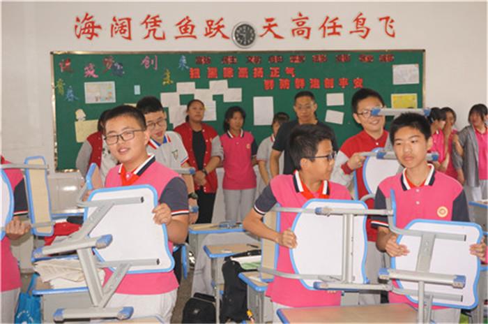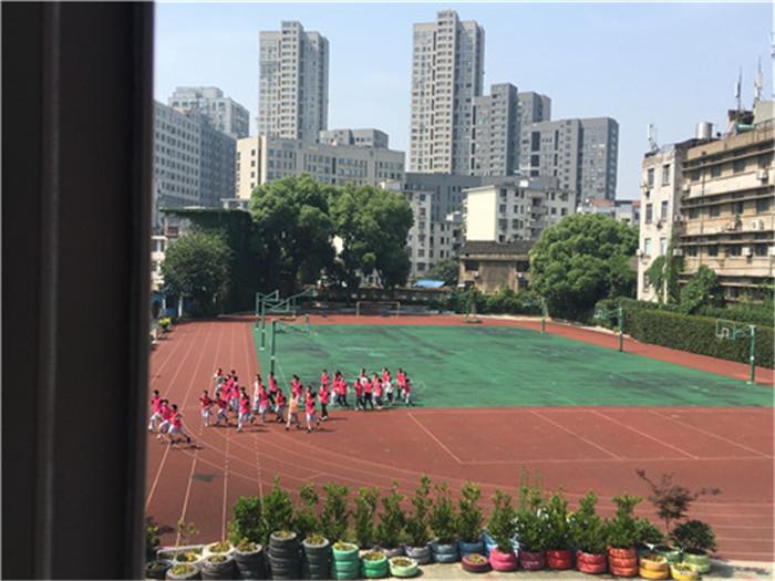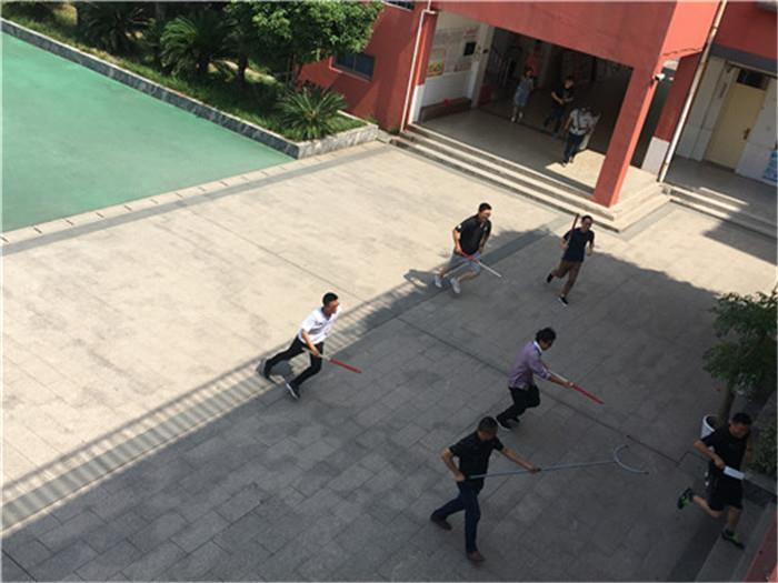 场景二:听到警报响起,操场上正在上体育课的班级在体育老师的组织下,迅速由教学楼东侧楼梯回教室。教室里的学生在老师的组织下关好门窗,拿起椅子进行自我保护。