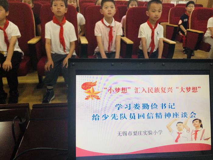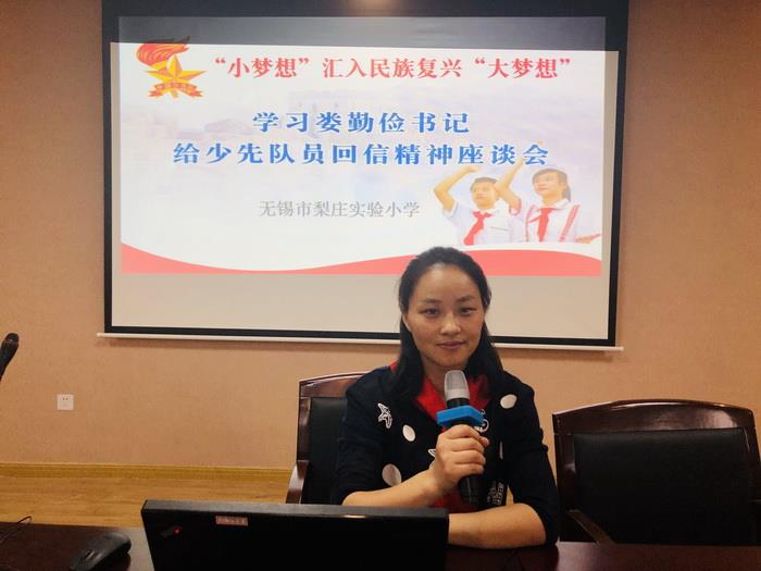 近日,无锡市梨庄实验小学全体辅导员齐聚阶梯教室,大家一起认真学习了娄书记的回信,加强认识理解。大队辅导员朱莱老师在交流中说:娄书记给南京市花港第一小学学生的回信,让我们倍感振奋,我们要认真学习、贯彻、落实娄书记回信精神,以回信精神为指导,推进我校少先队工作的改革,进一步教育和引领少先队员健康快乐成长,以实际行动迎接新中国成立 70 周年和少先队建队 70 周年的到来。朱老师希望各位辅导员一定将娄书记的回信精神传达到每一位少先队员,引导少先队员从小树立为中华民族伟大复兴而奋斗的远大理想,勤奋学习,勇于实践,努力成长成才。辅导员们纷纷表示:作为少年儿童的亲密朋友和指导者,一定会发挥好政治引领和价值引领的重要作用,引导少年儿童牢记党的关怀,了解党和政府关心少年儿童健康成长政策举措, 牢记党对少年儿童的期望,厚植感党恩、听党话、跟党走的红色基因,做好孩子筑梦道路上的铺路人。