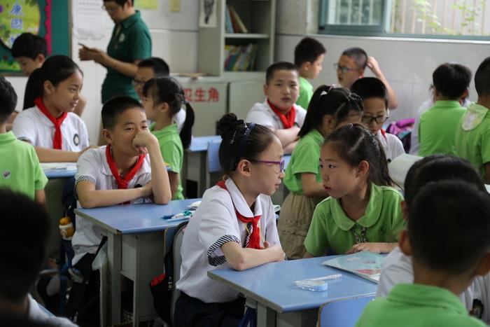 沁园实验小学四年级6个班分别承担了小学课程的展示任务,大班的孩子们悄悄地走到大哥哥大姐姐的身边,他们好奇地观察不一样的课桌椅,摸摸不一样的课本,用口齿并不清晰的声音诵唐诗,唱英语歌,把自己给逗乐了。