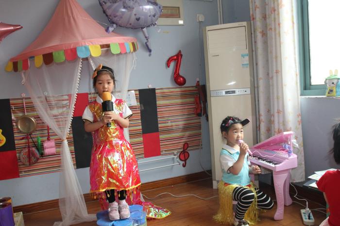 音乐区现场,孩子们自主选择,有的则盛装歌表演,有的选择各种器乐敲敲打打,还有的在后台涂色制作歌曲图谱,IPAD和小杜的熟练运用让孩子们学会了自主学习,自制音乐道具和现代化音乐器材的有机结合让孩子们徜徉在音乐区中,大胆自信的展示,给观看的老师们留下了孩子们活泼、大方、乐观的印象。