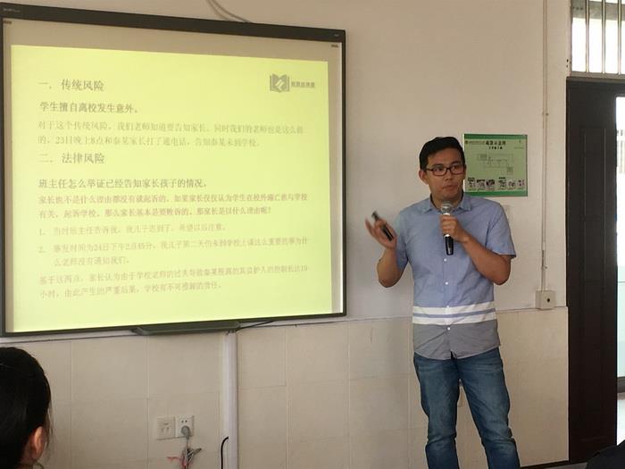 胡律师结合自身丰富的工作经验,用一系列鲜活的案例生动形象地诠释了法律知识在校园管理中的重要价值。他从“传统风险和法律风险”、“提高法律风险意识”、“为什么要研究法律风险防控”三点进行了深入浅出、通俗易懂的讲解,使教师在了解各类事故处理程序的基础上,增强了有效处置各类校园伤害事故的水平,对促进学校安全工作的顺利开展产生积极的推动作用。