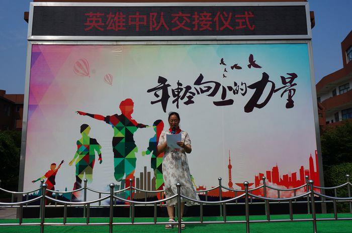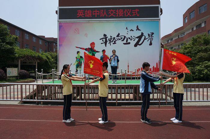在庄严的升旗仪式上,全体队员集结在操场上,手执队旗,满怀期待共同迎接着新一届“英雄中队”的产生。在黄冕校长宣读了交接决定后,原“英雄中队”的中队长们高举鲜红的队旗,与新一届“英雄中队”的队员们一起,迈着自信的步伐,走上了主席台。传递队旗的过程中,原“英雄中队”的中队长轻声叮嘱,随后将队旗郑重的交给新一届“英雄中队”中队长,也将沉甸甸的责任和希望再次传递。