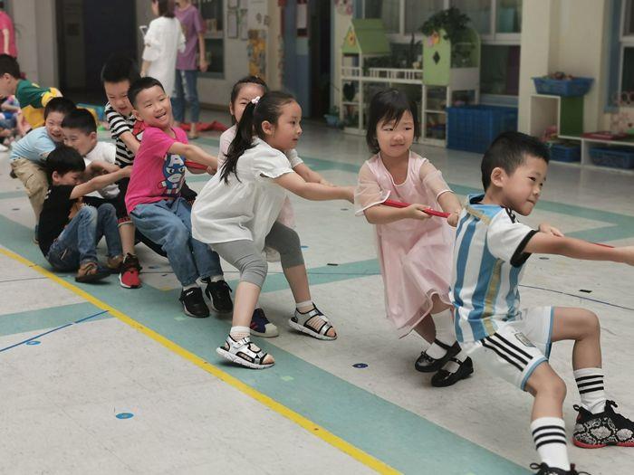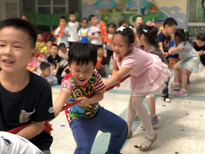 此次运动会比赛分为两个项目:个人跳绳和集体拔河。首先开展的是个人跳绳赛,每班选出5名选手,10人一组,时间为一分钟,在主持人程元跃老师的一声令下,小选手们兴奋地跳跃起来,场下立刻传来阵阵“加油”声,半分钟很快过去了,眼看一些小选手有些体力不支,但他们还是咬紧牙关,坚持到最后,最终获取了喜人的成绩。第二轮拔河比赛,六个班级分成三组,两两对决,三轮选出三个获胜班,再进行两轮决赛,比赛中小选手们齐心协力,劲往一处使,即使汗流满面,也不松手。最后大六班连胜三局,获取了年级冠军。比赛结束,主持人夏慧伊老师宣布成绩和名次,小选手们从程倩副园长手中接过奖状感到无比的自豪和喜悦。
