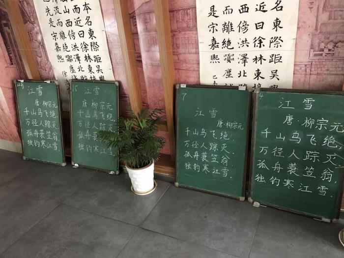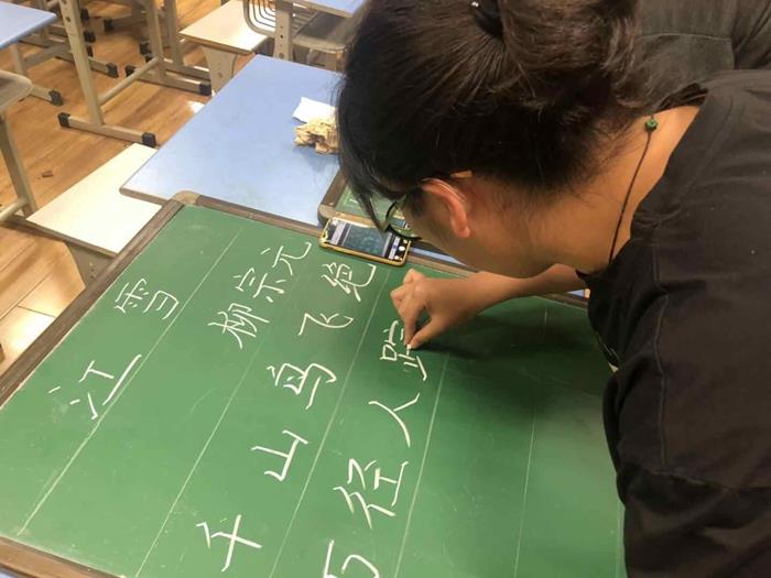 比赛采用现场书写的形式进行,板书内容统一,均为五言古诗《江雪》。比赛中,老师们全神贯注,一支支粉笔,在青年老师们的指尖自由自在地飞舞,沙沙的粉笔声演奏出美妙的旋律。老师们不急不躁,一笔一划地认真书写,一行行整齐的字体,或方正,或圆润,或清秀,或苍劲,充分展示了青年教师的教学基本功,可谓是“一分耕耘,一分收获”。