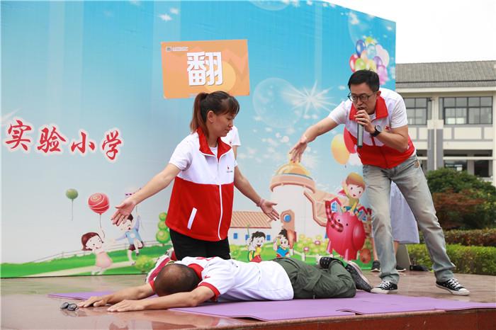 活动中,市红十字会的老师采用讲解与演示相结合的方式,教授给大家在突发事件来临时该采取的正确应对的方法。“喊”“翻”“挤”“拍”“按”五个动作是分别对应不同情境时可以采用的正确而有效的方法。全场体验、代表互动、应对抢答,生动的情境再现,让学生们在轻松的氛围中体会到遇事不应慌张,而应用简单有效的方法来面对、解决。