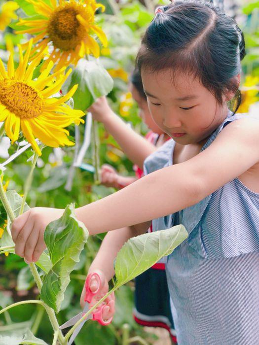近日,大班年级组的孩子们来到种植园地,开展采摘活动。孩子们分成几组,有的摘黄瓜品尝,有的摘向日葵回班级写生。孩子们一边收获,一边和同伴们聊着自己种植时的有趣故事。