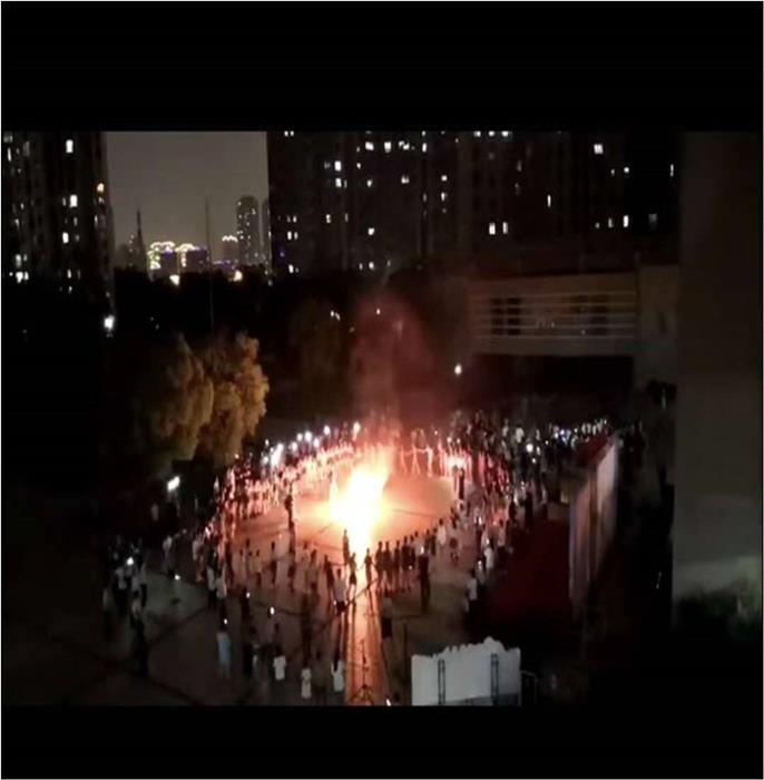 毕业典礼结束,操场上点燃熊熊篝火,夜色中的校园被火光照亮,老师和同学们手拉手围着篝火载歌载舞,歌声和笑声交织,火光和灯光辉映,这欢聚的画面久久定格在大家的记忆中,深深地刻在每个人的心田。