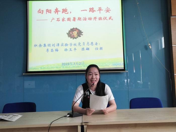 暑假伊始,积余教育集团刘潭实验学校党员志愿者李昌梅、徐玉平、陈翩老师应邀来到广石家园参加暑期活动开班仪式,并作《向阳奔跑 一路平安 》专题讲座,吸引近百名学生及居民参与。