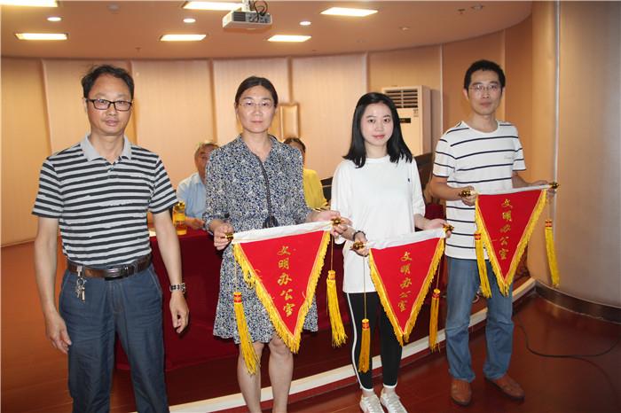 会议首先进行了表彰决定。学院领导为在“我心向党,携手三展”迎七一学习知识竞赛活动中获奖的同志颁发了奖状;为在学院2019年上学期文明办公室创建评比中获奖的办公室颁发了锦旗。