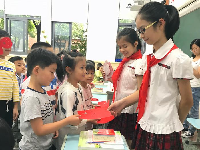 今天,是一年级新同学迈入小学的第一天,也是人生中的一个新起点。他们入学第一课的关键词是“爱国”和“尊师”。“姜奶奶剪纸艺术社”的同学们利用暑期用双手剪出了一面面小国旗,送给一年级的新同学。他们认真认识国旗,了解国旗的含义,滋生浓浓爱国情。他们向着将会陪伴他们一起快乐学习和生活的老师深深鞠躬,大声说出“老师,您好!”,透出浓浓尊师情。