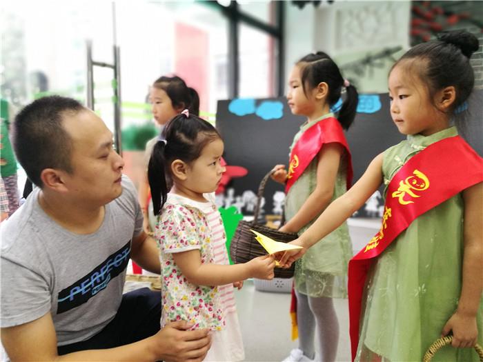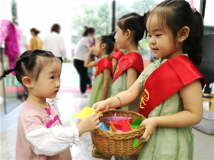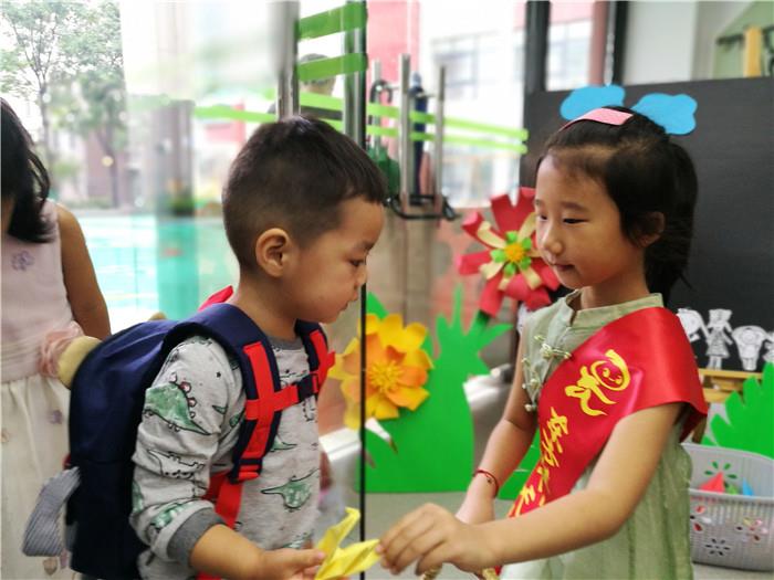 姚园长早早地站在大门口热情地迎接孩子们的到来,新老“朋友”相聚一堂。大班的礼仪小天使们手持装满与家人、老师共同制作“千纸鹤”的花篮,给全园所有的小朋友送上问候和礼物,预祝小朋友们新学期新开始……