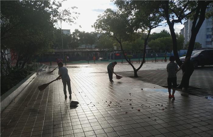 面对危情,学校各个部门,每位老师,立刻行动!行政和保安师傅组织校门口等候的家长进入保安室或屋檐下避雨;班主任有序组织,让放学的班级安静地在教室等候;已经放学的班主任利用学校走廊把本班学生安排在能看到校门的位置等待,并电话与家长取得联系安抚学生情绪;总务主任、安全员徐志东组织人员冒雨巡视校园,切断电源,疏通下水道,排除安全隐患;校领导和级部主任迅速进入各教学楼看护学生,防止学生玩水发生意外。5:00暴雨逐渐收敛,学校的积水开始慢慢退去,杭英校长又带领安保人员检查校园设施设备和滞留孩子的情况,因种种原因未能及时回家的孩子集中安排在保安室等待家长。第二天,双小老师们迎着曙光来到学校组织孩子们清扫,让双小校园又恢复了美丽和精彩!