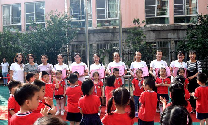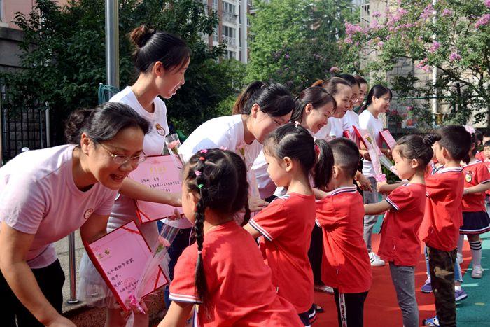 在这光荣神圣的时刻,经工会民主评选出来的9名师德高尚好园丁也走上红地毯,接受这份荣誉。毛伟园长、程倩副园长分别为好园丁们颁发证书,孩子们也为辛勤的园丁送上美丽的鲜花作为祝贺。作为优秀教师代表的侯雪老师、沙宇老师和大家分享了自己的获奖感言。孩子们在老师的带领下演唱优美舒缓的歌曲《老师》,并结束了升旗仪式。紧接着,为进一步倡导廉洁从教的师德师风,全体教师开展了《师德承诺书》签订仪式。园所五十余名教师在幼儿园发放的师德承诺书上郑重签名,这是一份师德承诺,更是一份爱的宣言。作为一名幼儿教师,见证孩子成长的点滴、成为孩子亲密的伙伴、支持孩子创意的行为……都将是教师最大的幸福。在这样的节日里,孩子们的一个拥抱、一句祝福,家长的一声问候,一个感谢,都是对老师无限的肯定。随后,幼儿园还组织开展了师徒结对仪式,青年教师为老教师们奉上清茶一杯,亦师亦友,携手共进。师徒结对是幼儿园培养新教师成长的途径之一,通过骨干带新人的方式,不断引领教师获得更好地发展。