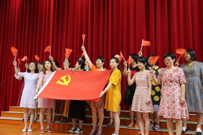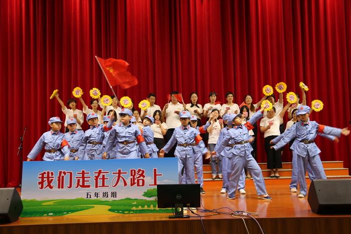 随后,精彩纷呈的节目就开始了,在演唱中,全校教师以年级为单位着装整齐,井然有序,敞开心扉,释放激情,唱响红色经典!大家用激昂嘹亮的歌声,火一样的热情表达了对党和祖国的热爱。《没有共产党就没有新中国》、《我的中国心》、《红旗飘飘》、《我和我的祖国》、《我们走在大路上》、《保卫黄河》等历久弥新的经典红歌再一次唱响校园,时而轻柔婉转,时而跌宕激昂。各年级演唱的歌曲形式多样,各具匠心,有齐唱、合唱、领唱,配着舞蹈唱,歌声或甜美、或铿锵、或轻柔、或昂扬,无不展现了新时代沁小教师积极向上的精神风貌和拳拳的爱国之心。
