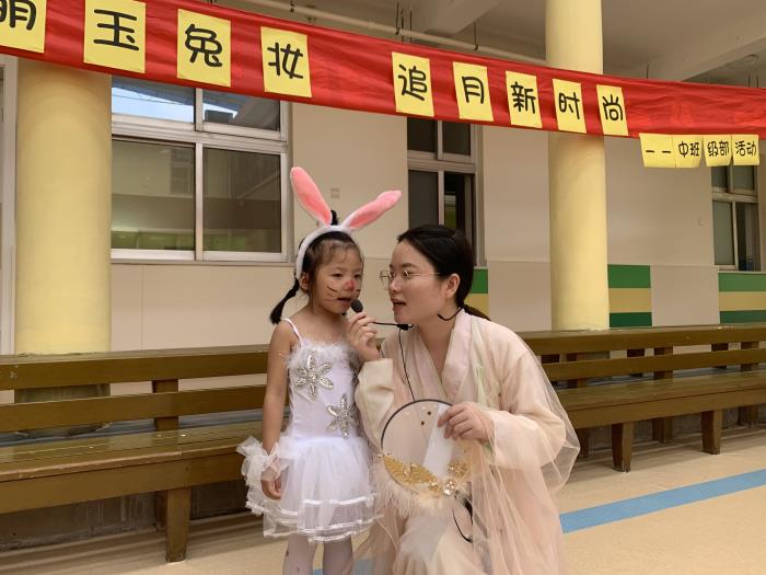 大班级部开展了“当汉服遇上中秋”,每个孩子都穿起了汉服,起舞弄清影,欣赏诗词《中秋夜》《静夜思》《水调歌头》等,让幼儿感受到经典诗词和儿歌的美,体验节日快乐的同时,深刻感受中国传统文化的精髓与魅力。中班级部开展了“软萌玉兔装 追月新风尚”主题活动,通过游戏形式让幼儿体验做月饼,制作玉兔头饰、化玉兔妆等,在动手动脑过程中感受和同伴、老师一起庆祝中秋的热闹和快乐,体验追月新时尚。小班级部则开展了“月儿圆圆 月饼甜甜”品尝月饼活动,通过唱唱跳跳,吃吃玩玩的方式,了解中秋节吃月饼的习俗,感受与同伴分享的快乐。