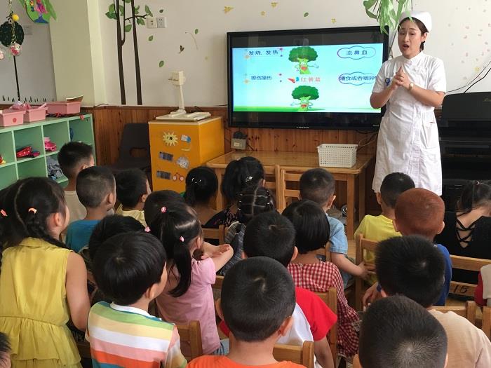 活动中,医生妈妈结合幼儿园孩子的成长特点和需求,通过课件形象生动的讲解、练习、互动问答等方式,深入浅出地为孩子们讲解摔伤、擦碰伤、气道异物梗塞、发热、流鼻血的现场应急处理及注意事项。接着医生妈妈和孩子们一起练习自救互救知识及现场救护技能。最后医生妈妈对“徒手心肺复苏术”的具体操作进行了讲解和演练,手把手指导孩子们亲手实践。