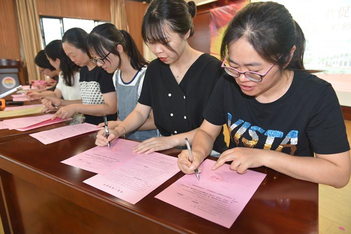 在结对活动上,陆燕副校长宣读了本年度师徒结对的名单,毛彩练教导就青蓝工程的目的、意义和内容作了说明。江一飞作为辅导教师作了发言,杨珩艺、王紫萱两位今年新入职的教师作了表态发言。陈杭萍副校长对参加“青蓝工程”结对活动的青年教师提出了“立师德”“练师能”的殷切希望,她指出:“青蓝工程”活动是一项双赢的活动,在结对中,师徒都会得到各自的成长,在成就别人的同时也成就了自己。四对师徒现场签订了“青蓝工程”协议书。