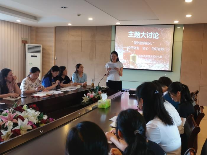 活动中,戴红娟园长首先带领全体教师重温了“四有好教师标准”,再次深刻领会了教师的初心和使命;接着教师们学习了贾利民、许军则、封莉容、范徽丽等2019年全国教书育人先进楷模的事迹,并以年级组为单位展开 “如何做有‘匠心’的好老师”精彩的大讨论。讨论中教师纷纷阐述了自己的观点:有的说有匠心就是要有扎实的知识基础,还需要有爱心、耐心、细心;有的说好老师要用爱和真心拉近与幼儿的距离,滋润幼儿的内心;还有的说匠心就是教师对自己的教学教育能力的精雕细琢与精益求精,是更完美的精神理念。