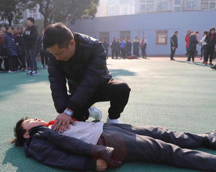 “快来人,操场上有学生晕倒了,快,拨打120……”次日上午课间操,老师们正和学生一起跳皮筋,突然,一名学生脸色苍白,大汗淋漓,晕倒在地,在场的老师立即上前判断孩子情况并就地抢救,予以胸外心脏按压,人工呼吸,并拨打“120”……紧急抢救后,倒地学生慢慢睁开了双眼,意识逐渐恢复,颈动脉出现搏动,自主呼吸恢复了。