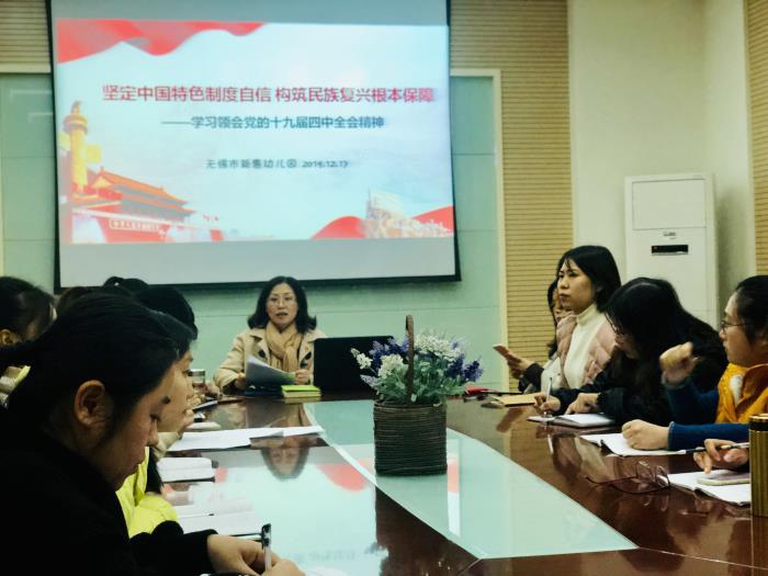 12月17日下午,新惠幼儿园组织全体教师学习领会党的十九届四中全会精神,杨静娴园长主持本次学习。