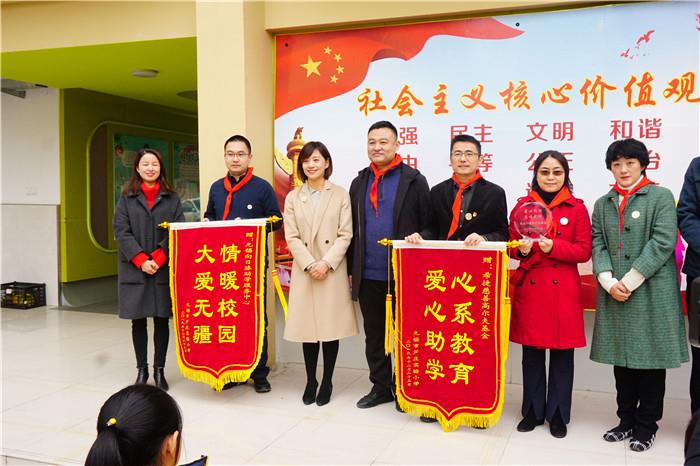 希捷慈善高尔夫基金一行为芦小学生代表赠送了文具用品。铜牌的传递,是一份厚重的爱心,吴校长和王校长代表学校回赠了锦旗和水晶纪念牌,感谢两个公益组织的爱心之举。