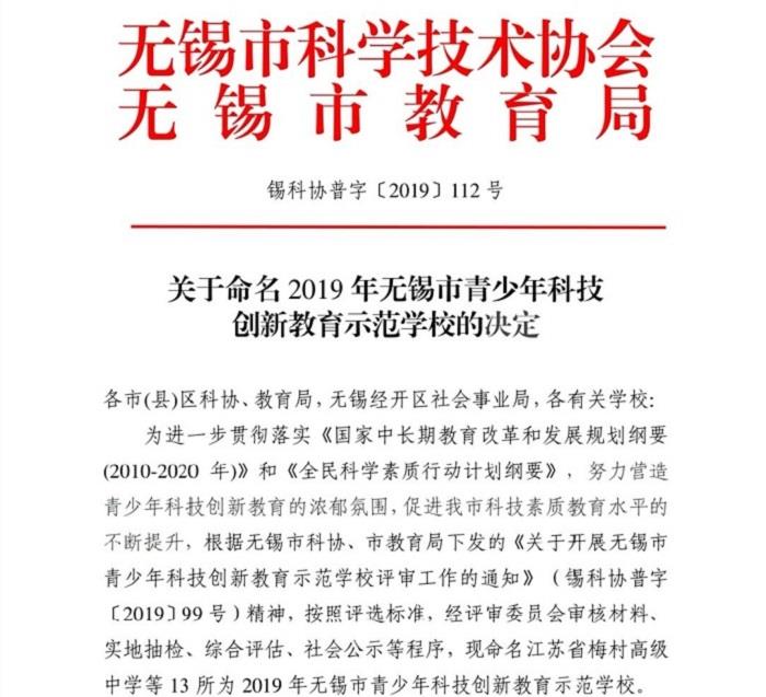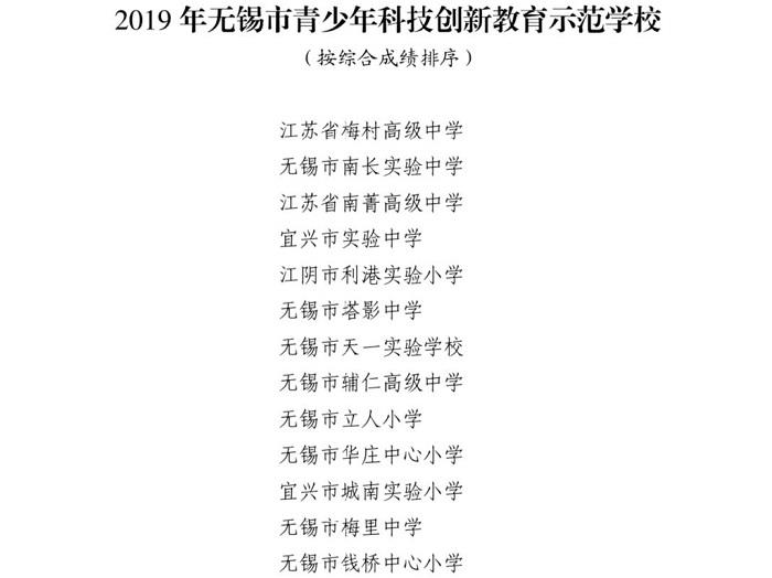 近日,塔影中学被无锡市科学技术协会、无锡市教育局命名为“2019年无锡市青少年科技创新教育示范学校”。<?xml:namespace prefix = o />